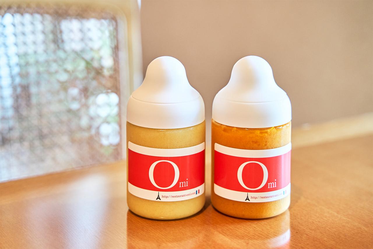サラダには、自家製ドレッシングをかけて。人参、玉ねぎという2種のドレッシングは材料のほとんどが野菜だといい、「野菜に野菜をかけるような感じ」と大参さん。保存料や着色料も使われていない、ヘルシーさもうれしい。店頭販売もあり、リピーターが多いという。ボトルもかわいいから、食卓に置いておきたくなる。