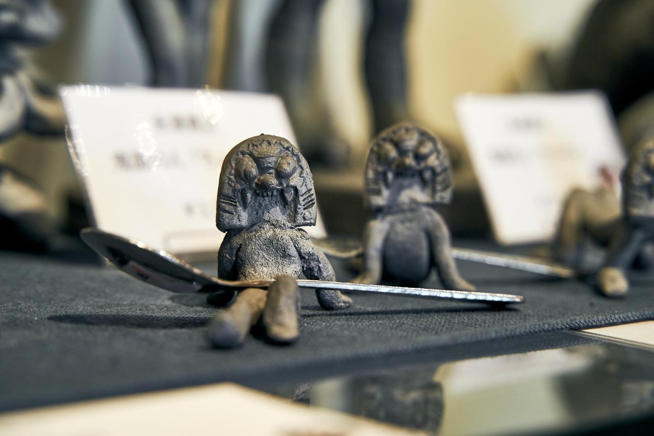 若手の鬼師、永濱貴之さんは、鬼面を人形にしたユニークな作品を作っている。この角がない鬼面は、奈良時代以前に作られた古代鬼面と呼ばれるものだそう。カトラリーレストやフィギュアなど、心をふっと軽くしてくれるユニークなものばかり。