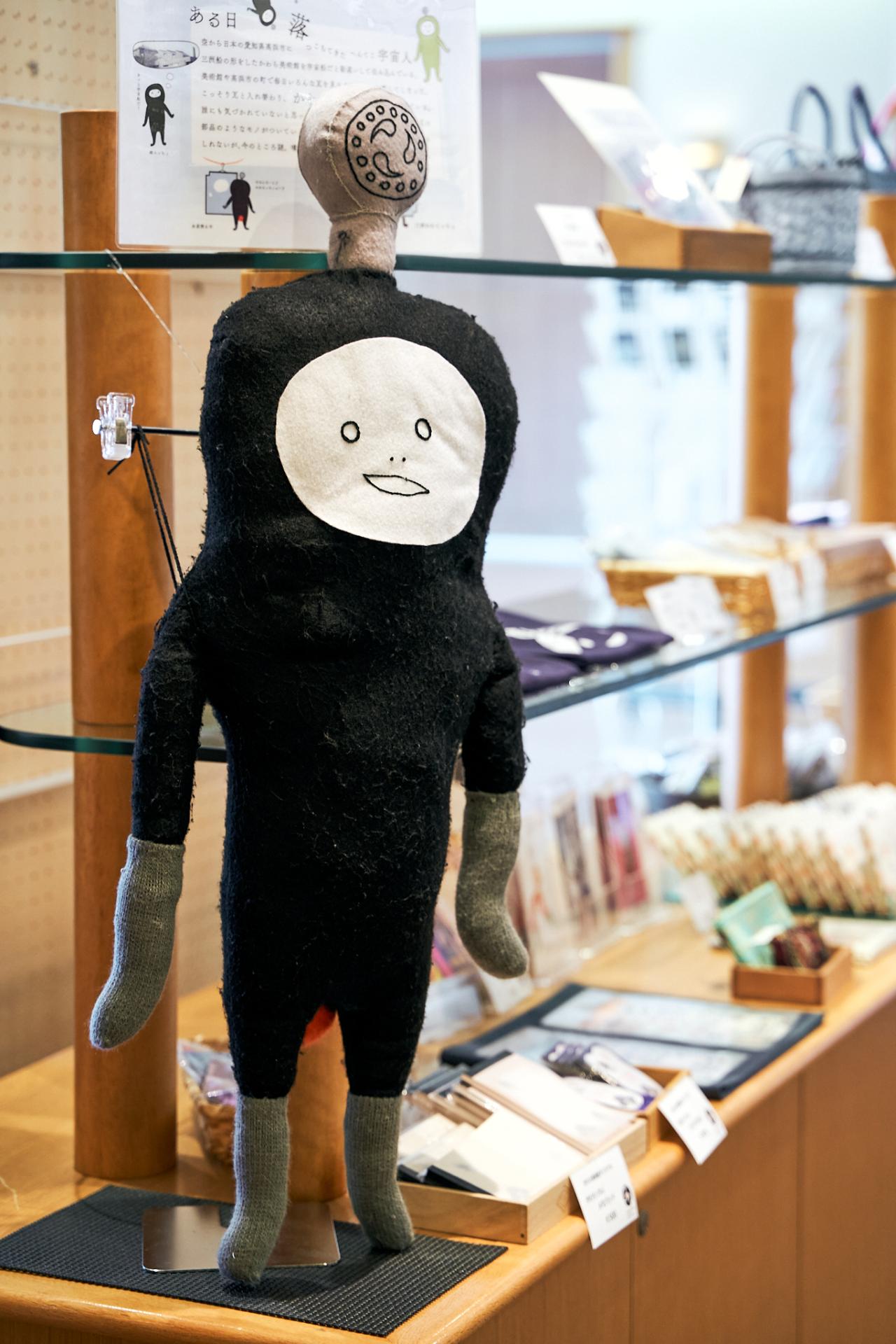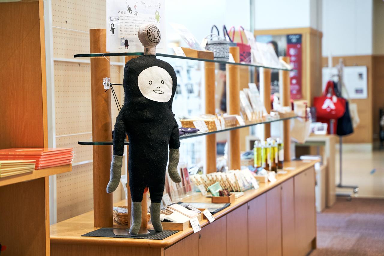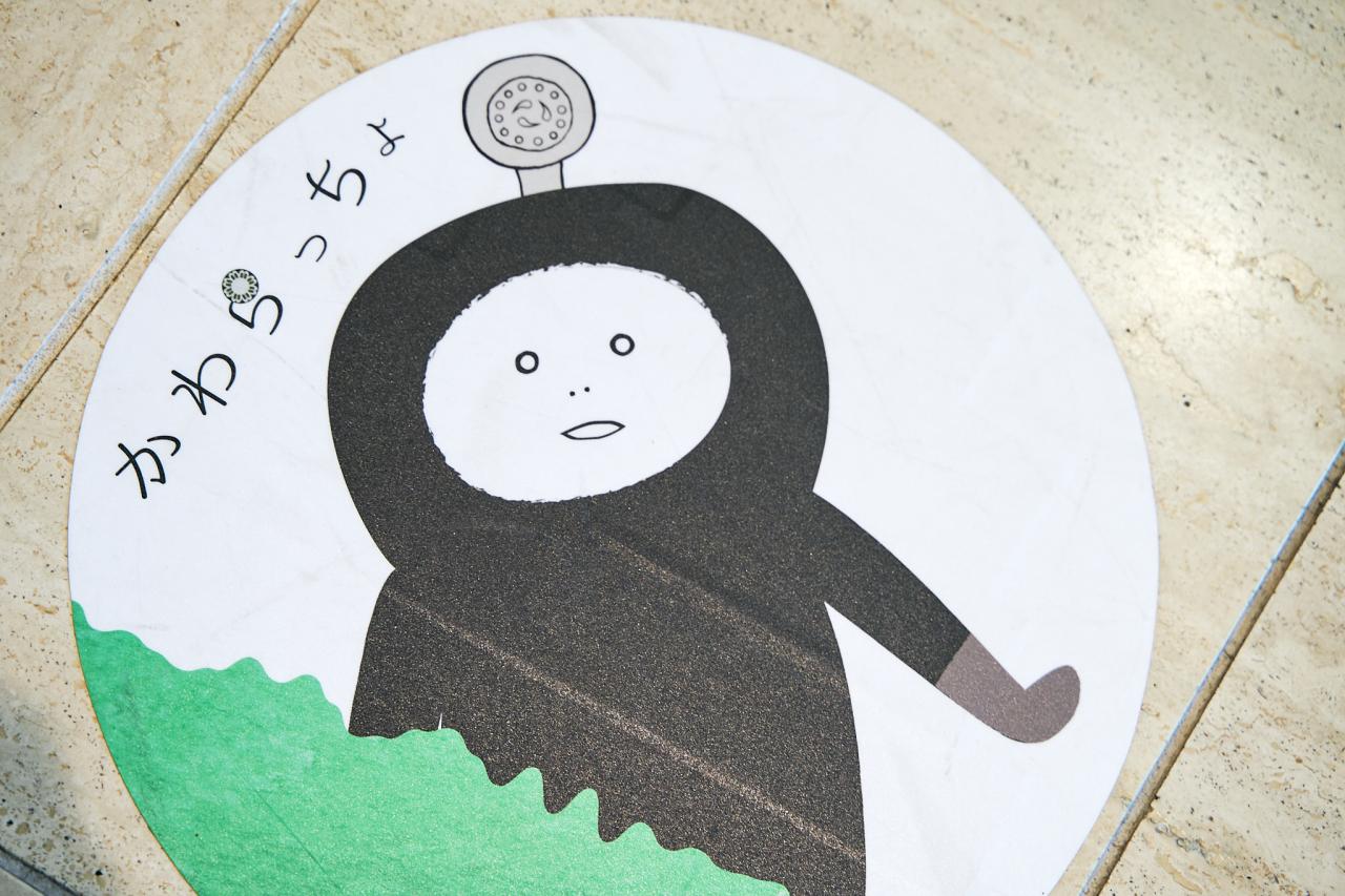 店内を見渡すと、ゆるくてかわいいキャラクターがあちこちに。正体は、美術館のオリジナルキャラクター「かわらっちょ」。美術館スタッフの手作りぬいぐるみになって飾られていたり、足元のステッカーになっていたり。美術館を宇宙船と勘違いしてやってきた宇宙人のかわらっちょは、瓦に恋して、瓦の着ぐるみを手作りして楽しんでいるのだそう。cuu designさんによるデザインだ。