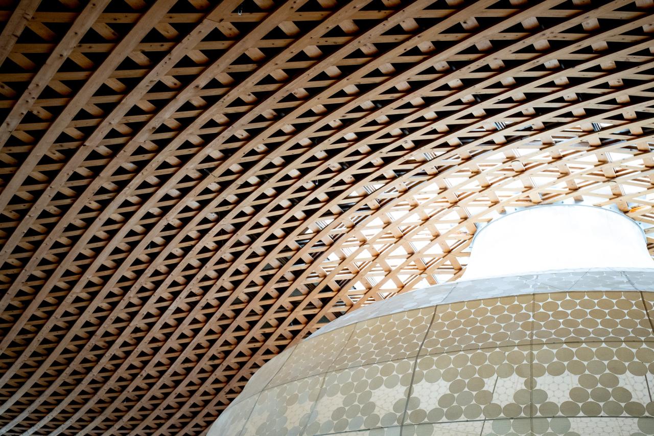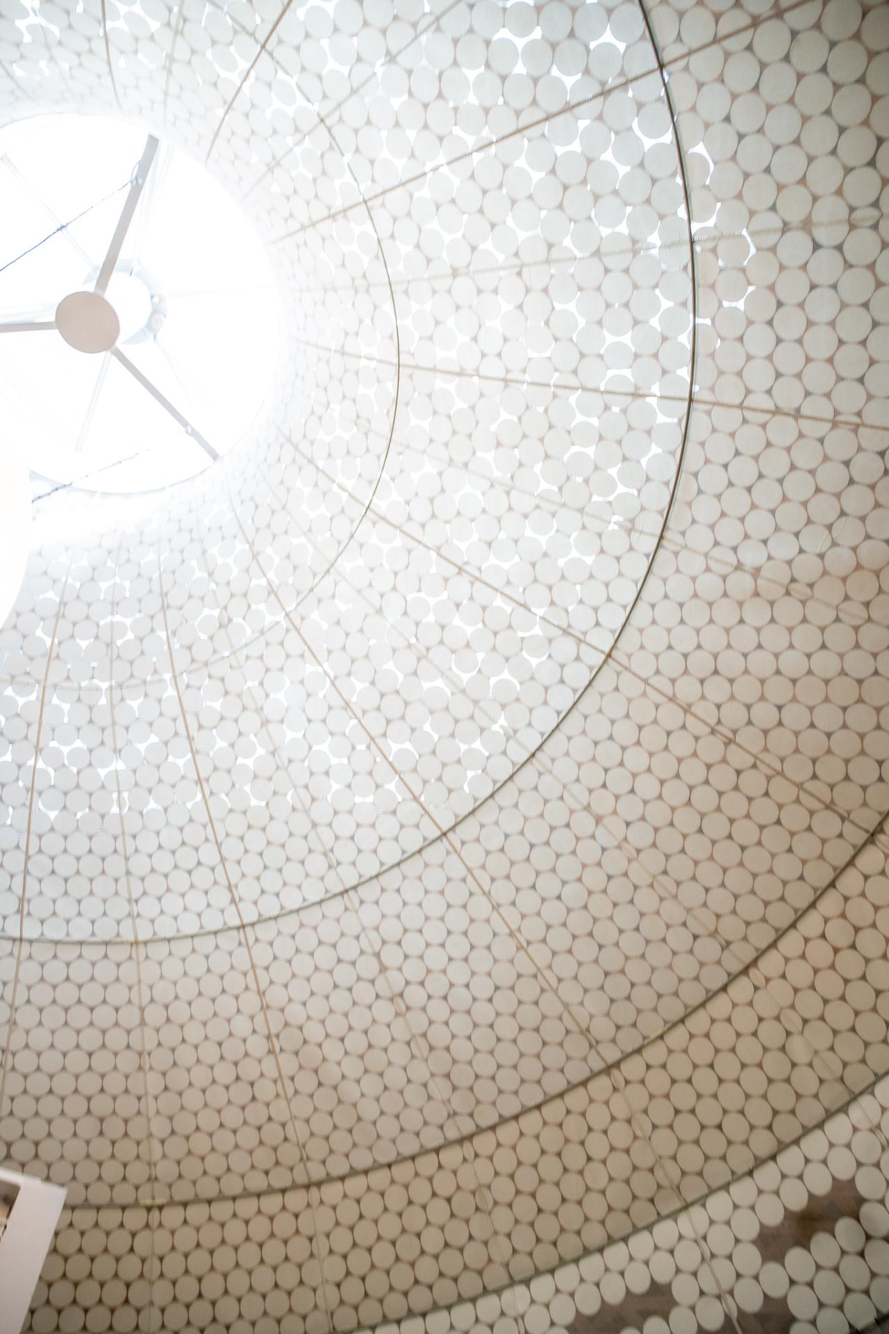 天井に流線型で組まれた格子といい、巨大な傘?パラソル?といい実際に訪れてみると圧巻の空間です。