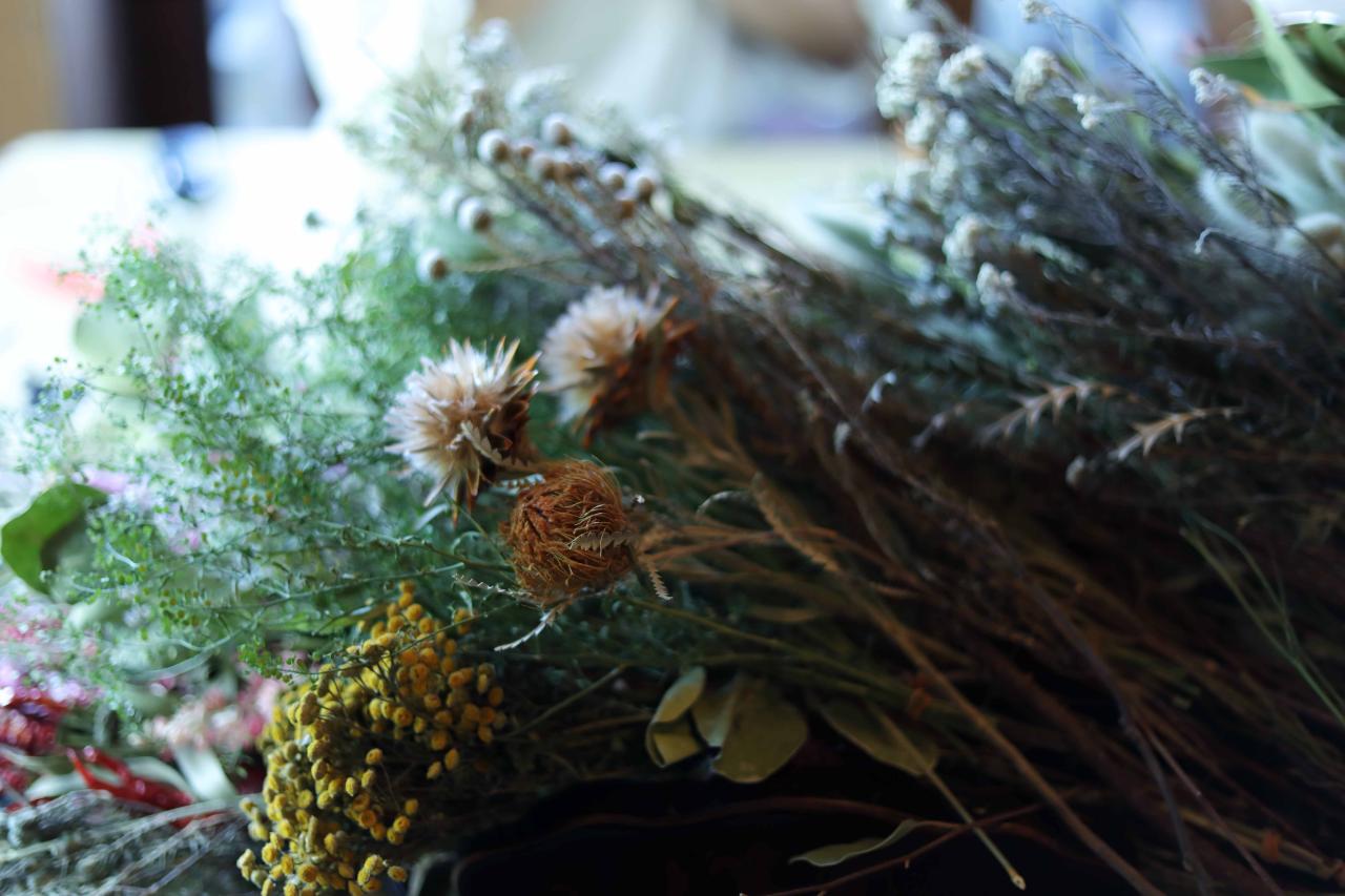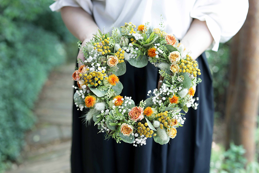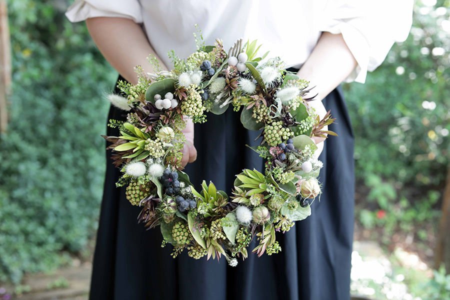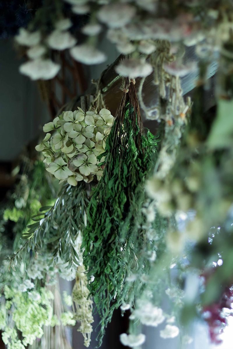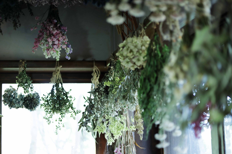 もともとアパレル関係の仕事をしていたという和田さん。ドライフラワーとの出会いは、山で立ち枯れたアジサイを目にしたことからだった。アジサイは枝に花をつけたまま自然に枯れることがある。植物本来の美しさと、その味わいのある姿に一瞬で虜になったという。