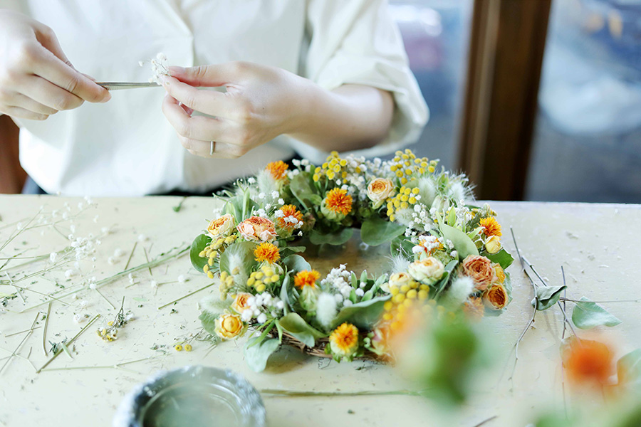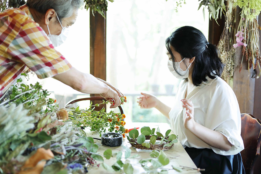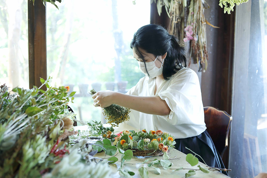 〈ドライフラワーギャラリー ダーワ〉では、完全予約制のドライフラワー教室を毎日(木曜は定休日)開催している。オープン5年目からはじめ、最初は口コミで広がったこの教室、ここ最近ではSNSをきっかけに来店する人が増えたそう。関東や遠いところでは岡山県など、県外から多くの人が訪れるほどの人気教室になっている。