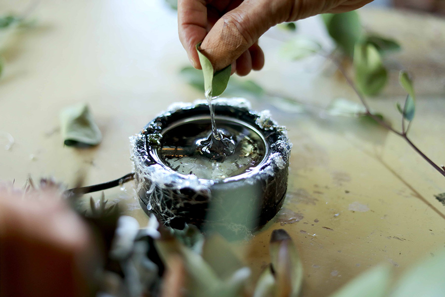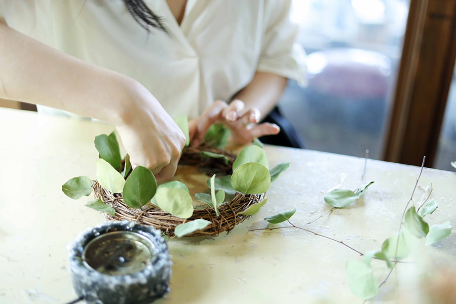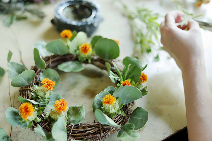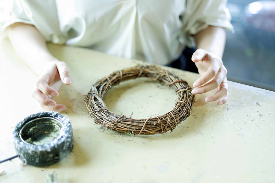 ユーカリの葉に合わせて、高さを揃えるのもポイントのひとつ。きれいなドーナツ形になるように意識してつくると、ぐっとこなれた印象の仕上がりになる。ときおり和田さんからアドバイスをもらいながら慎重に作業していく。