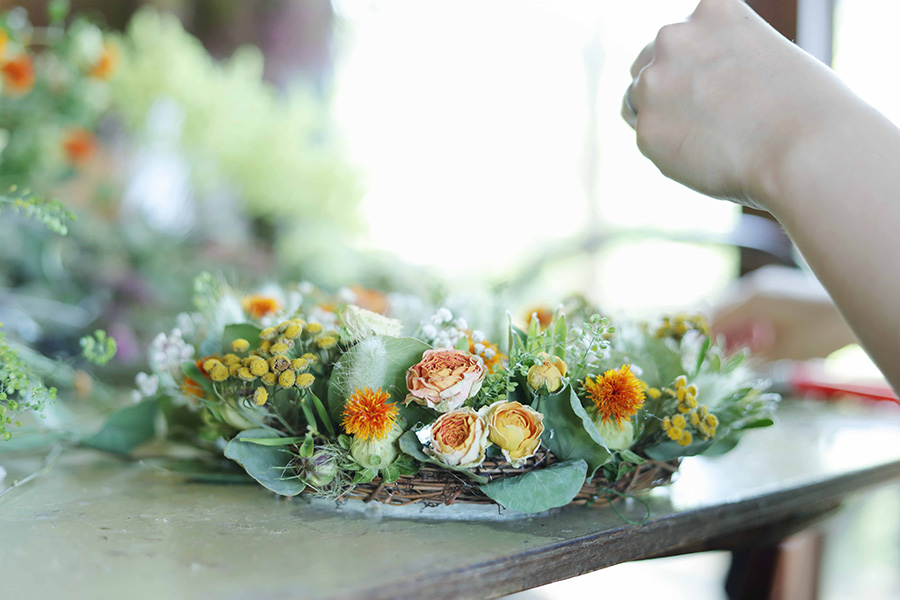花材を贅沢に使ってモノづくりの楽しさを味わえる。