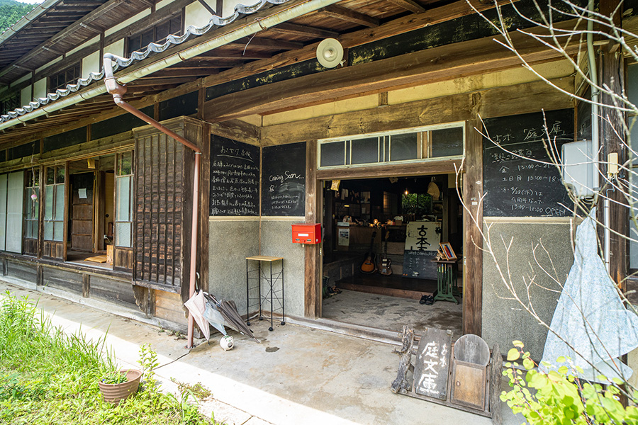 愛知県と長野県とに隣接する岐阜県恵那市は、面積の8割近くを森林が占める自然豊かなまち。市内には木曽川が流れ、名勝・笠置峡が有名だ。近年は、東京五輪でポーランドチームが合宿をしたことでカヌーも流行っていたり、大きな岩が点在することから笠置山がロッククライミングの聖地と呼ばれたりしている。今回訪れた〈庭文庫〉は、築100年以上の山の中の古民家を改装した本屋。JR中央本線と明知鉄道明知線が乗り入れる恵那駅から約10km、駅からクルマで約15分ほど走ったところにある。店主の百瀬雄太さん、実希さんが迎えてくれた。