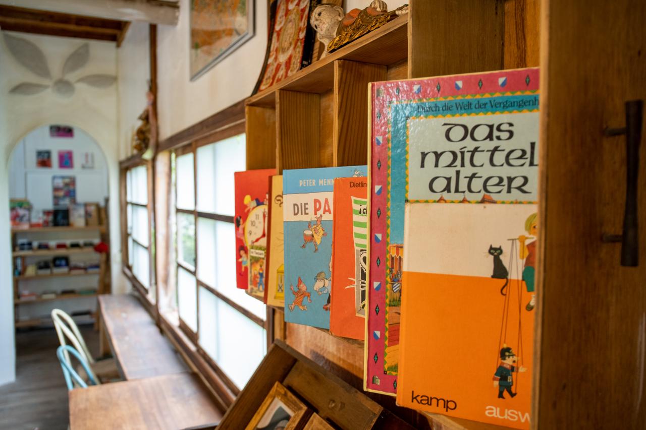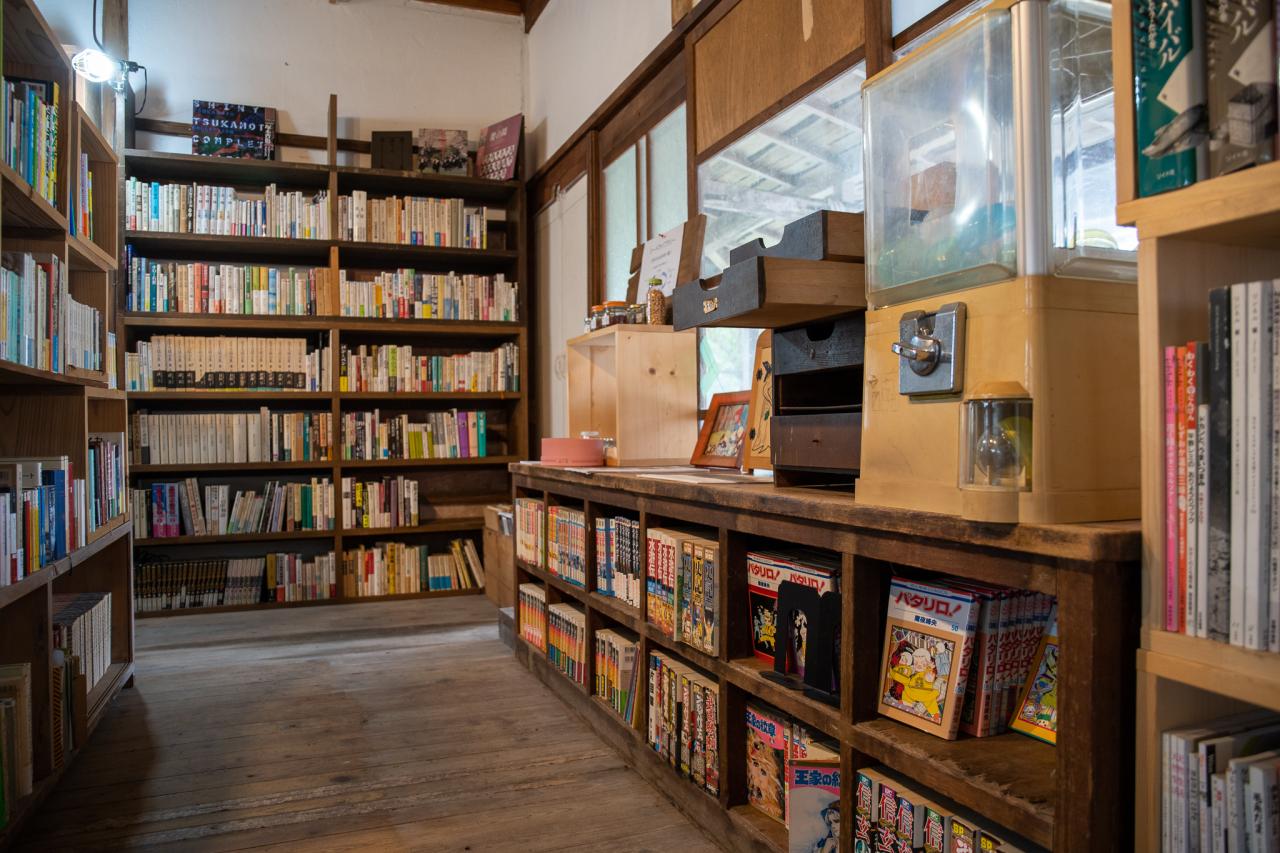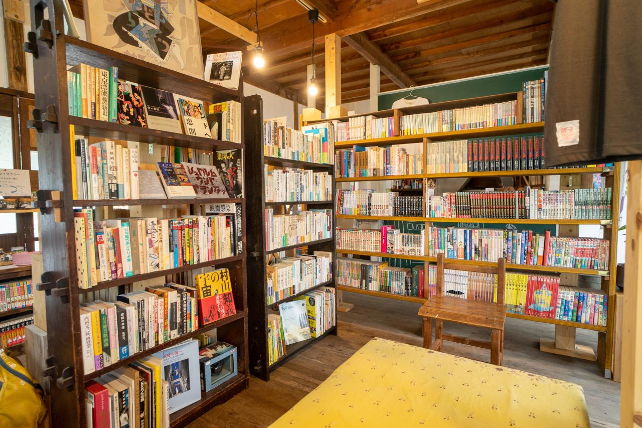古屋さんは就職を機に上京して、しばらく東京で働いていた。結婚して子どもが生まれてから、東京を離れることを考え、地域おこし協力隊として徳島県に移住した。3年ほど過ごして、知り合いの紹介で富士宮にやってきた。「母屋と納屋と畑があって、何かできそうだと思いました。観光スポットに近くて、富士山もよく見えて、家の前に湧き水も出ている。環境のよさもここを借りる決め手になりました」。古屋さんは振り返る。最初はコワーキングスペースをつくろうと始めてみたが、計画は変わった。「週末に多くの人がキャンプに来る地域なので、需要があると思ったんです。でも自分たちが興味を持てなかった(笑)。2人とも本が好きだし、蔵書もたくさんあったので、図書室にしようと」。オープン時に知り合いの映像作家が本を寄贈してくれたり、オープン後は地域の人が漫画を寄贈してくたり、自身が好きな本を購入したり。増え続ける蔵書は、もともと納屋にあったものをリメイクしてつくった棚などに収められている。