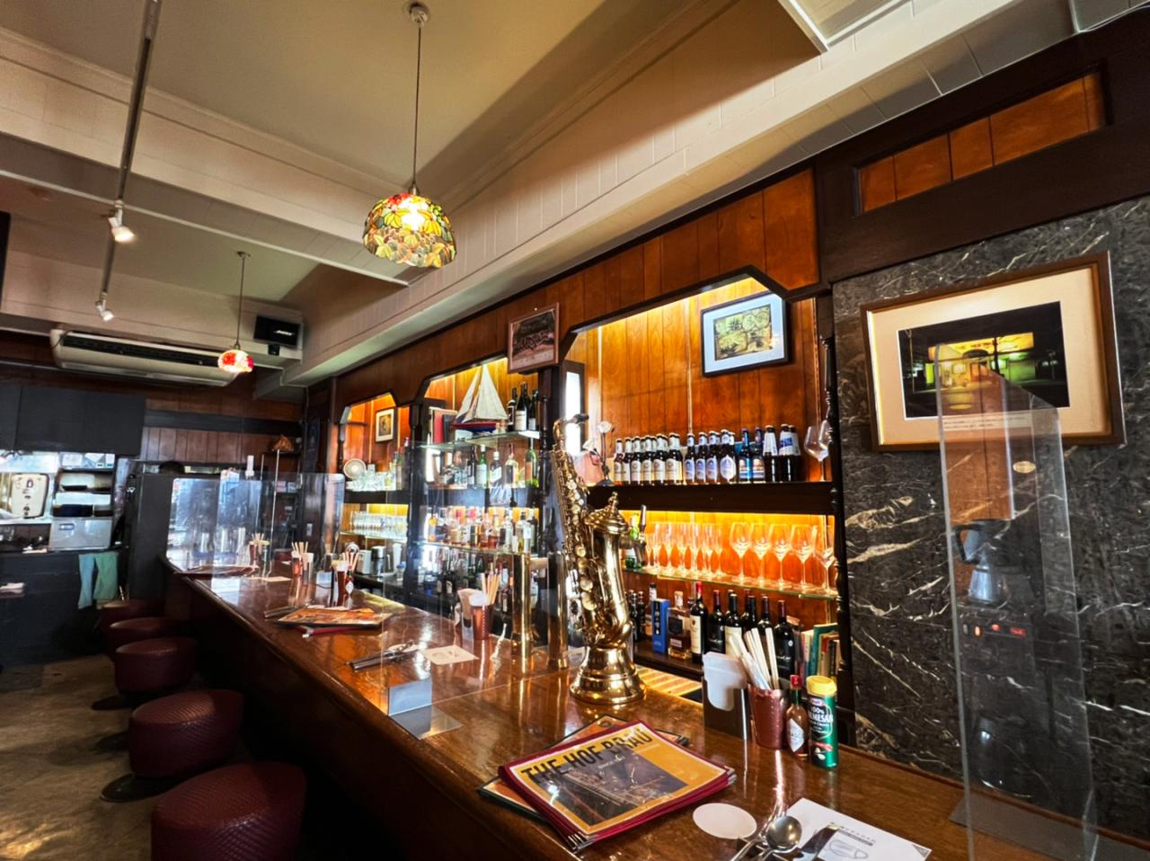 店内には、バーカウンターも。ウイスキーやリキュールなどもかなり充実していますが、なかでも本物のサックスをくりぬいて作ったというビールサーバーが目を引きます。こちらのお店のメインはドイツから直輸入しているというホフブロイの生ビール。世界一有名なビアホールともいわれる「ホフブロイハウス」で醸造されたビールで、店名の由来でもあります。お昼の時間に伺ったにもかかわらず、後から入店されたお客さんたちも『とりあえずビールを』と次々注文し、料理と一緒に愉しんでいました。