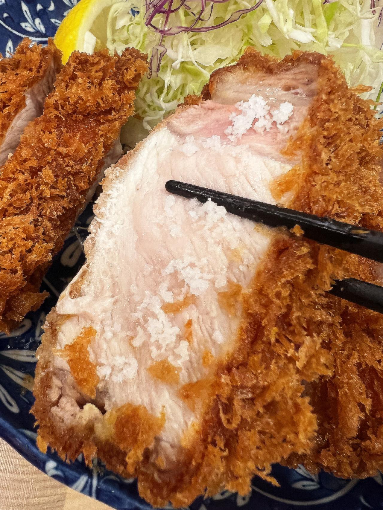 一人前のカットの分厚さにも驚愕ですが、衣をまとったその仕上がりも迫力満点!ひと切れ持ち上げるのにもお箸にずっしり重みを感じます。おすすめの食べ方は、カウンターに並んだ様々な種類の「塩」で味わうこと。ソースももちろん“鉄板”ですが、塩で食べると脂の甘味がさらに引き立ちます。また、茎わさびをつけて食べればすっきりとした味わいに変わり、ひと切れごとに色んな味わいを楽しむことができるのもこの店ならではです。
