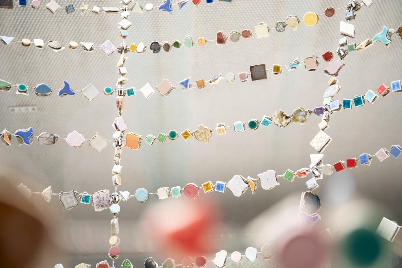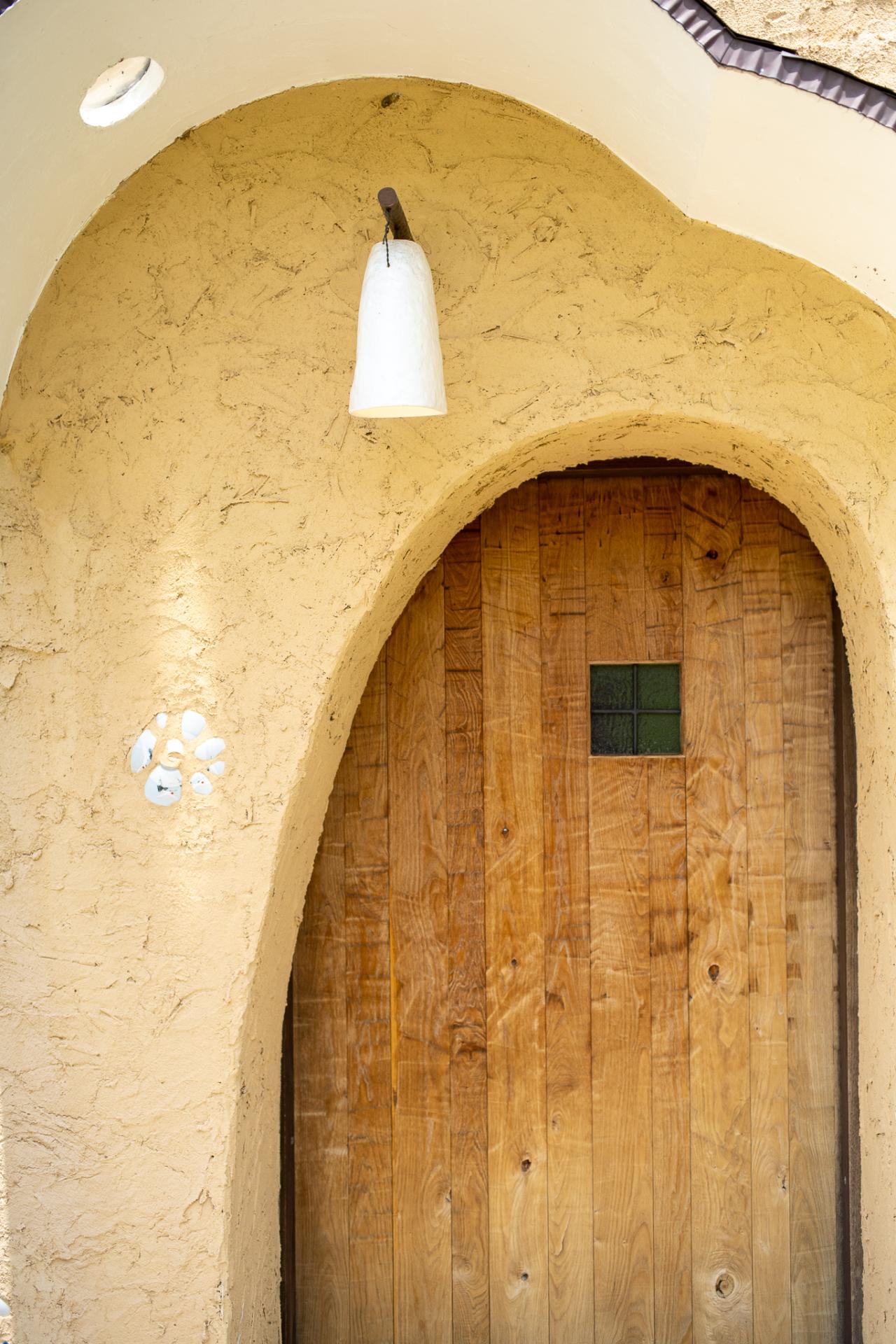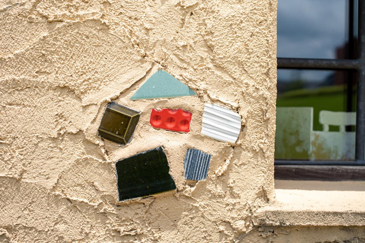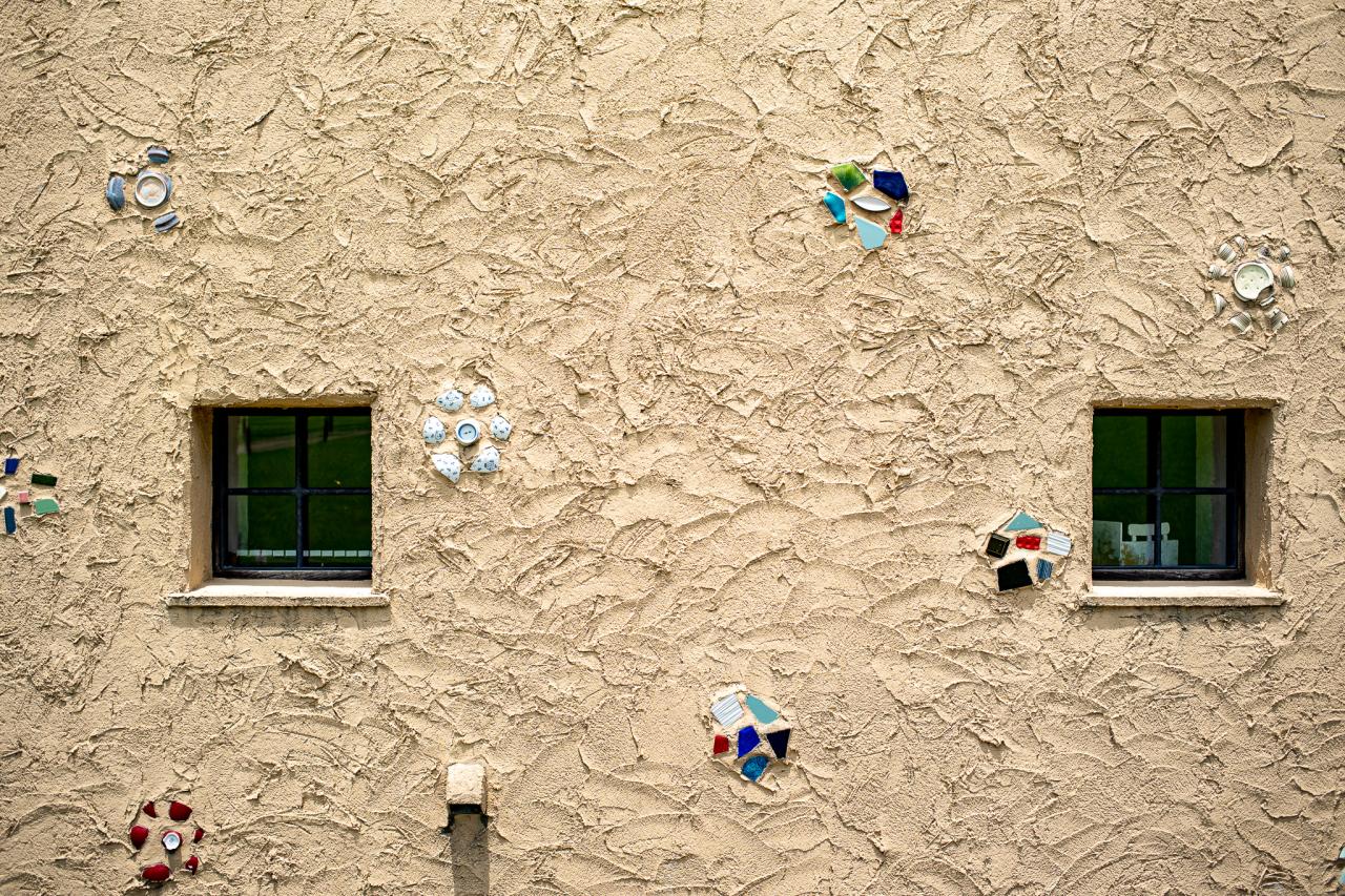 よく見てみると、外壁には茶碗やタイルの破片が埋め込まれていて、同じ形はひとつとありません。それが規則的な模様となっていて、不思議と味わい深く感じます。
