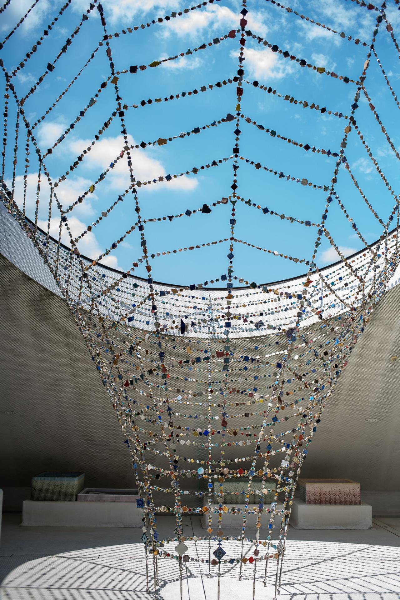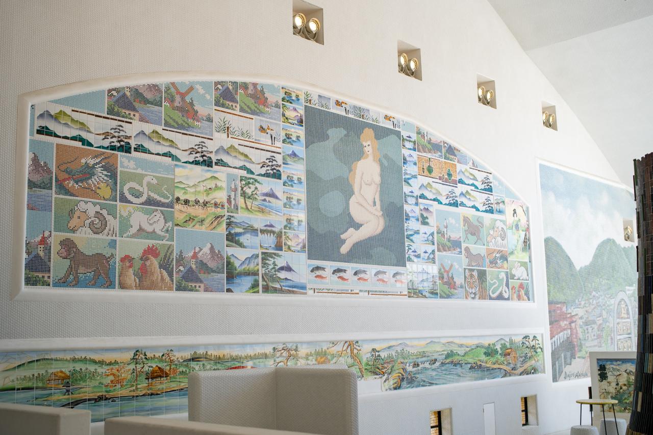 屋根が円形に切り取られ、そこにはタイルのカーテンが空に向かって広がっています。壁も床も白いタイルで気持ちのよい空間に、昔のタイル製品などが展示されてありました。