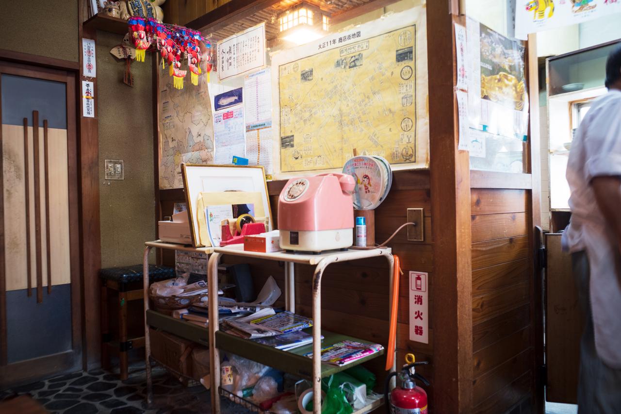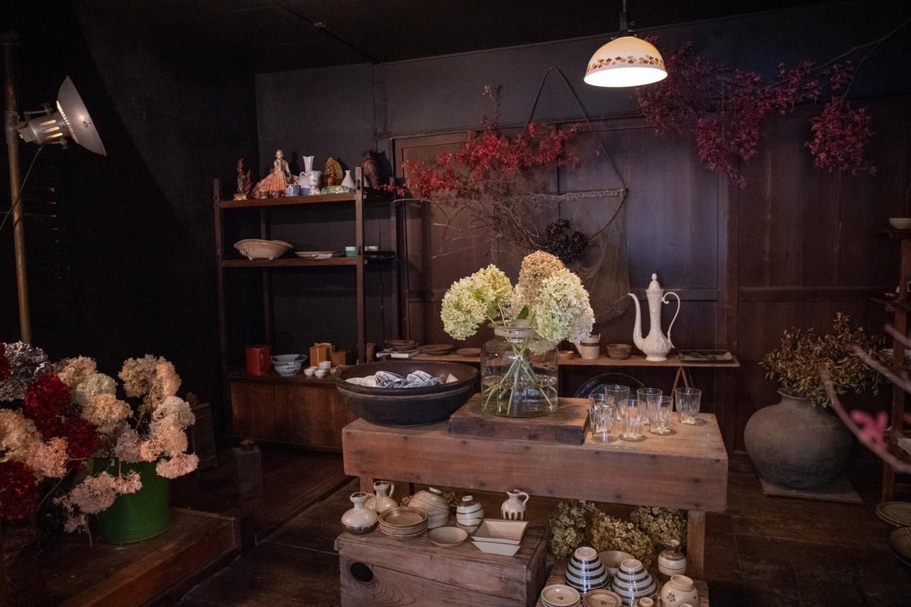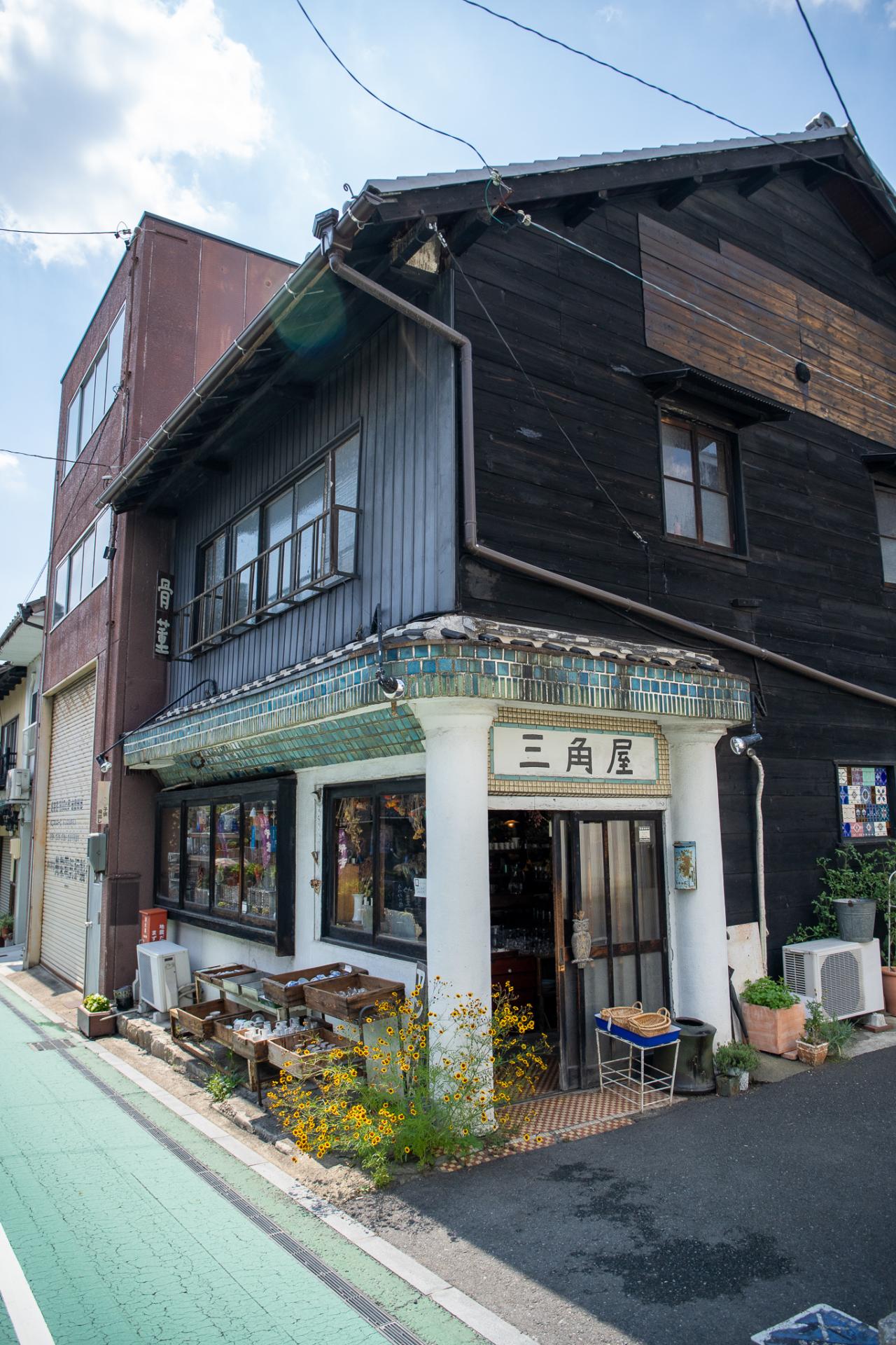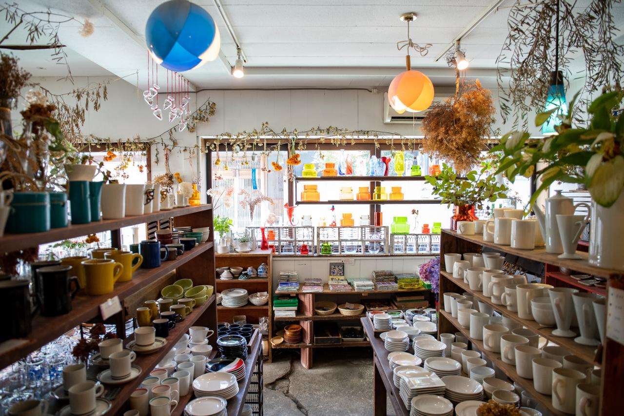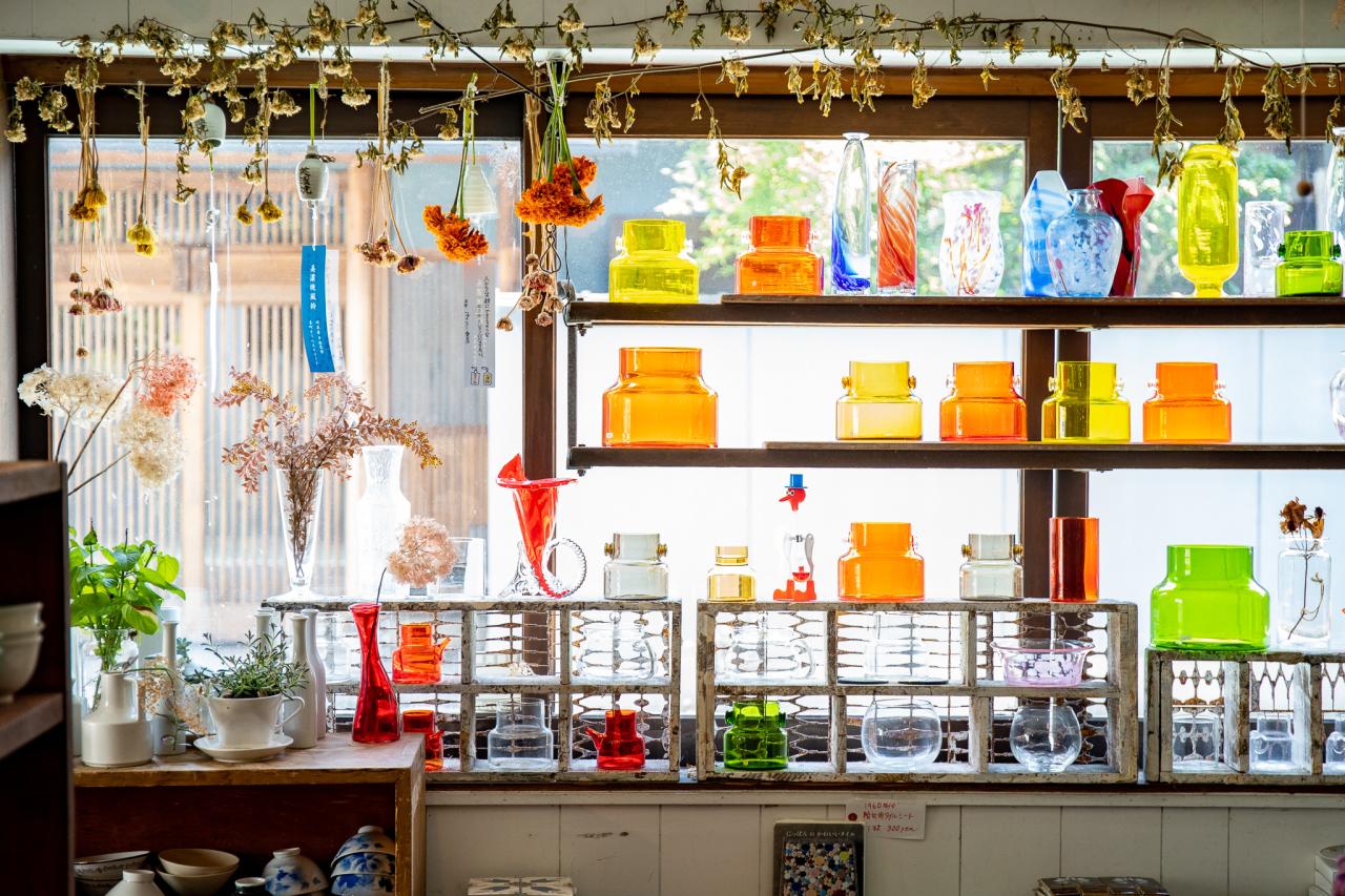 しばらく歩いていくと、ファサードに素敵なタイルがあしらわれた「三角屋」というお店が目につきました。店内にはアンティークの小物や食器たちが並び、主にデッドストック品だというカラフルなガラスの器が、窓から差し込む光でキラキラしています。