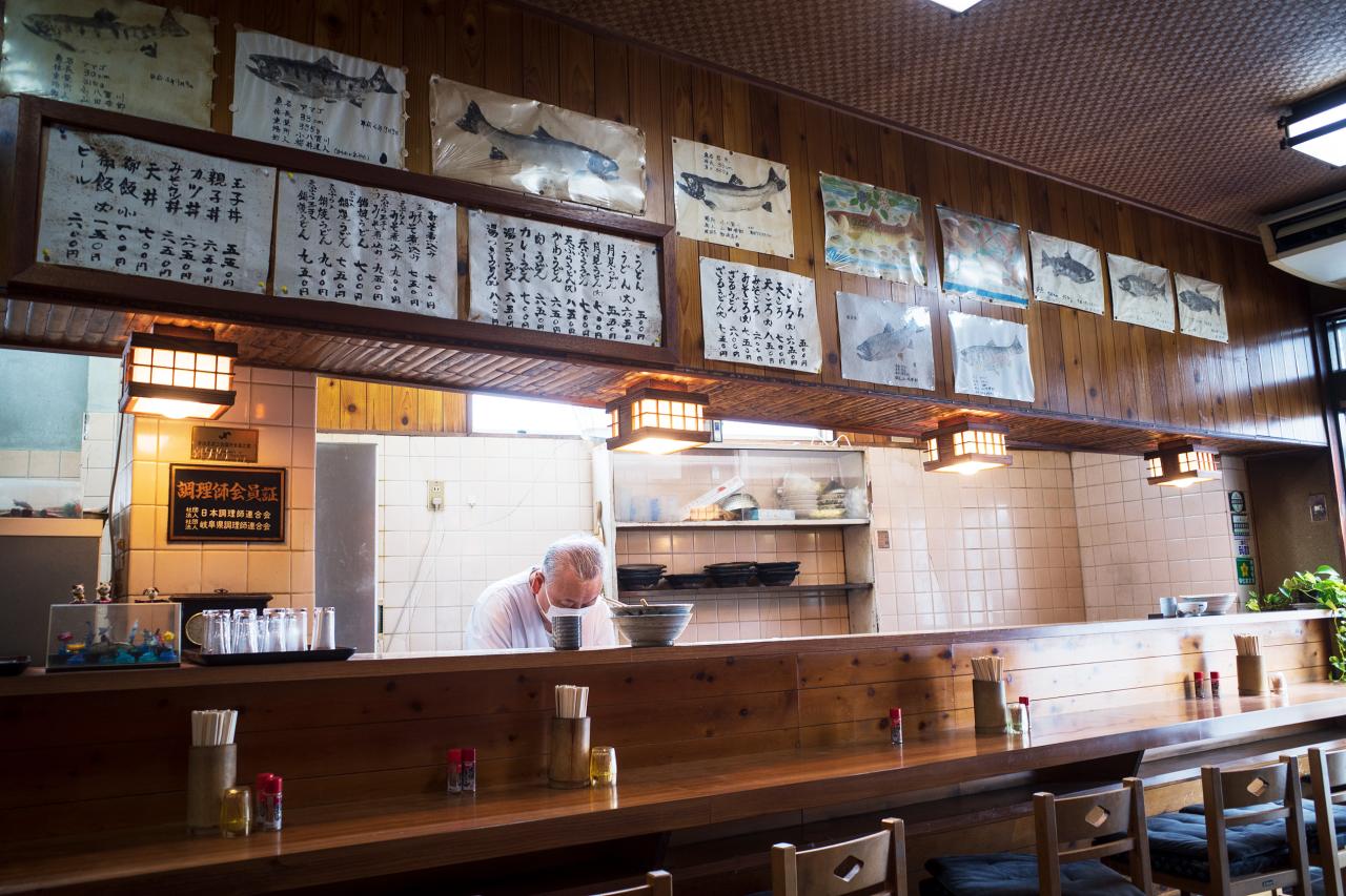 本町オリベストリートをすっかり堪能し、多治見橋を渡って駅の方へ歩いていると、味わい深い佇まいのうどん屋さん「竹の子」を発見。年季の入った暖簾をくぐると、カウンターとテーブルのコンパクトな作りながらも、雰囲気があります。壁に貼ってあるメニューを見ると「ころ」とあり、聞くと主に東海地方で食べられているうどんだそう。